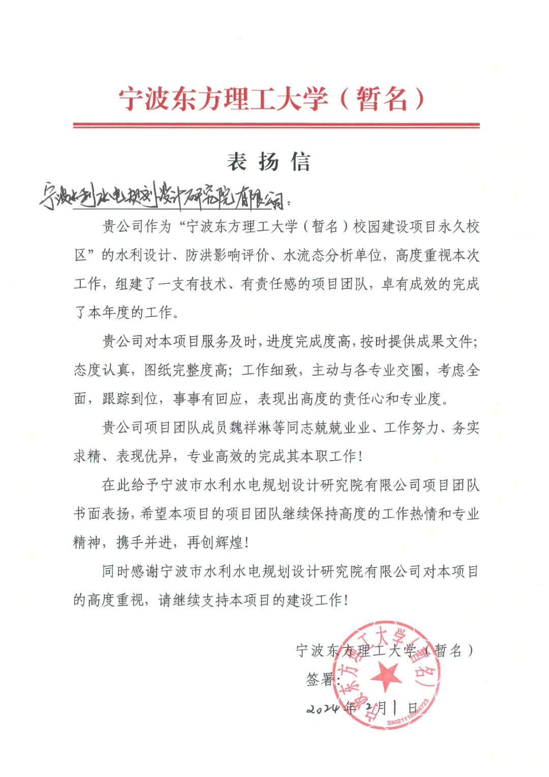 一封感謝信 點(diǎn)贊工匠精神—— 寧波市水利院收到來自寧波東方理工大學(xué)的感謝信