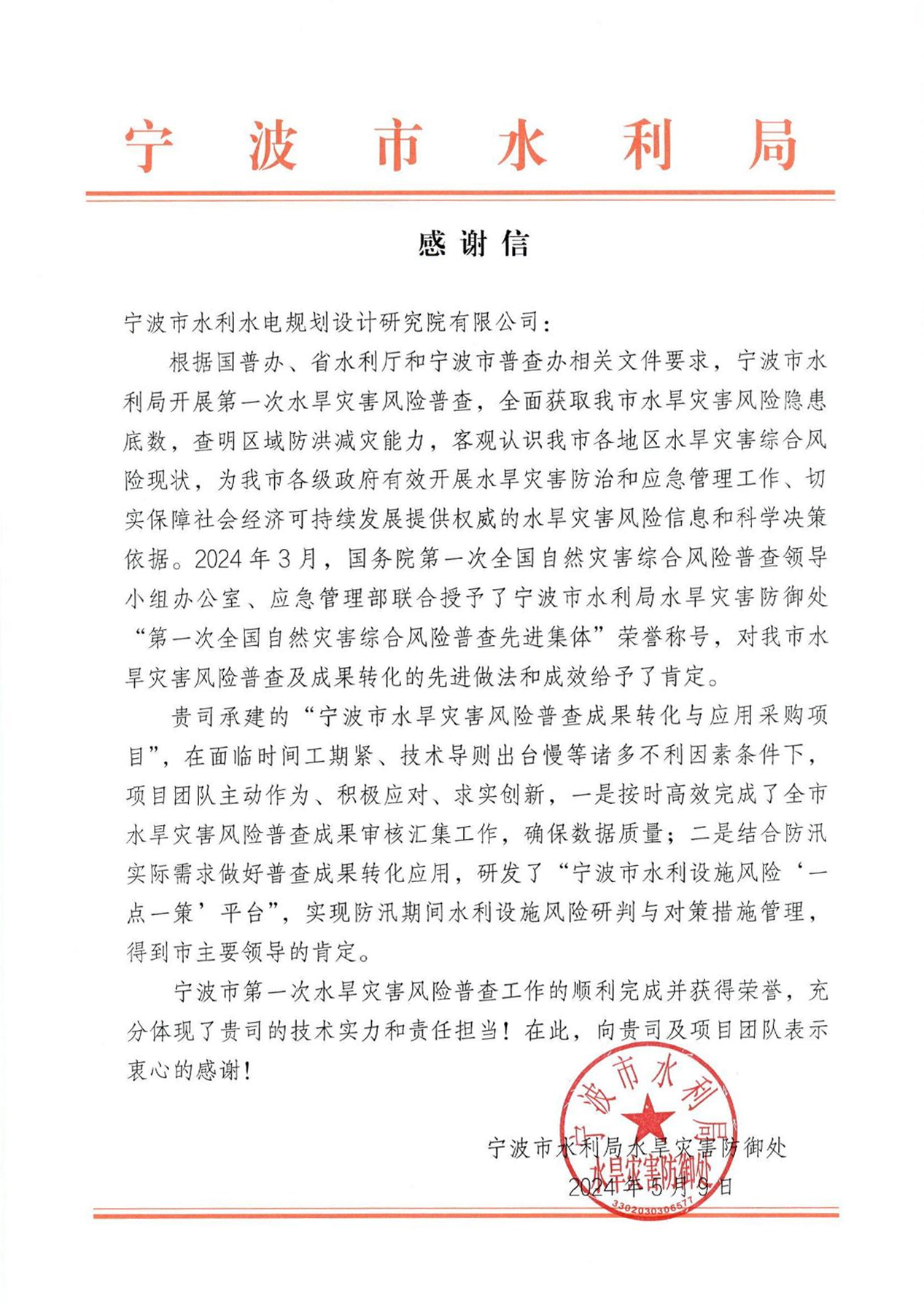 為寧波市水利院點(diǎn)贊——一封來自寧波市水利局水旱災(zāi)害防御處的感謝信