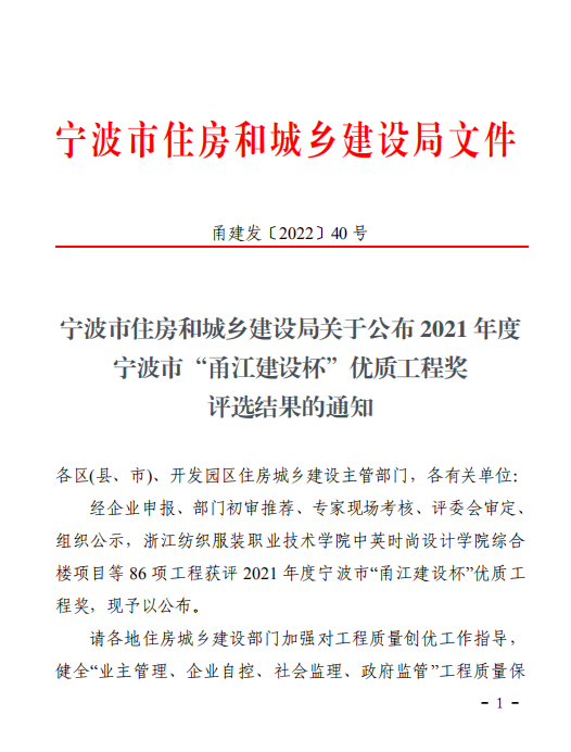 我院兩項(xiàng)工程榮膺2021年度寧波市“甬江建設(shè)杯”優(yōu)質(zhì)工程獎