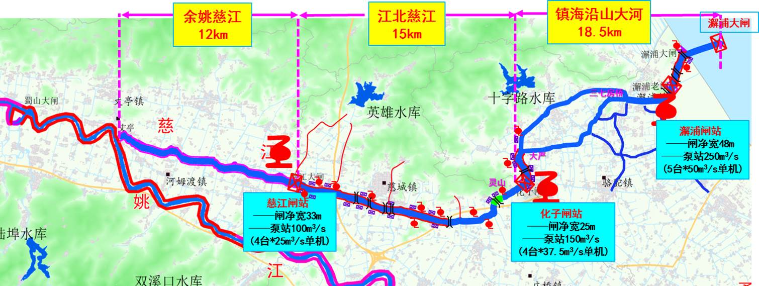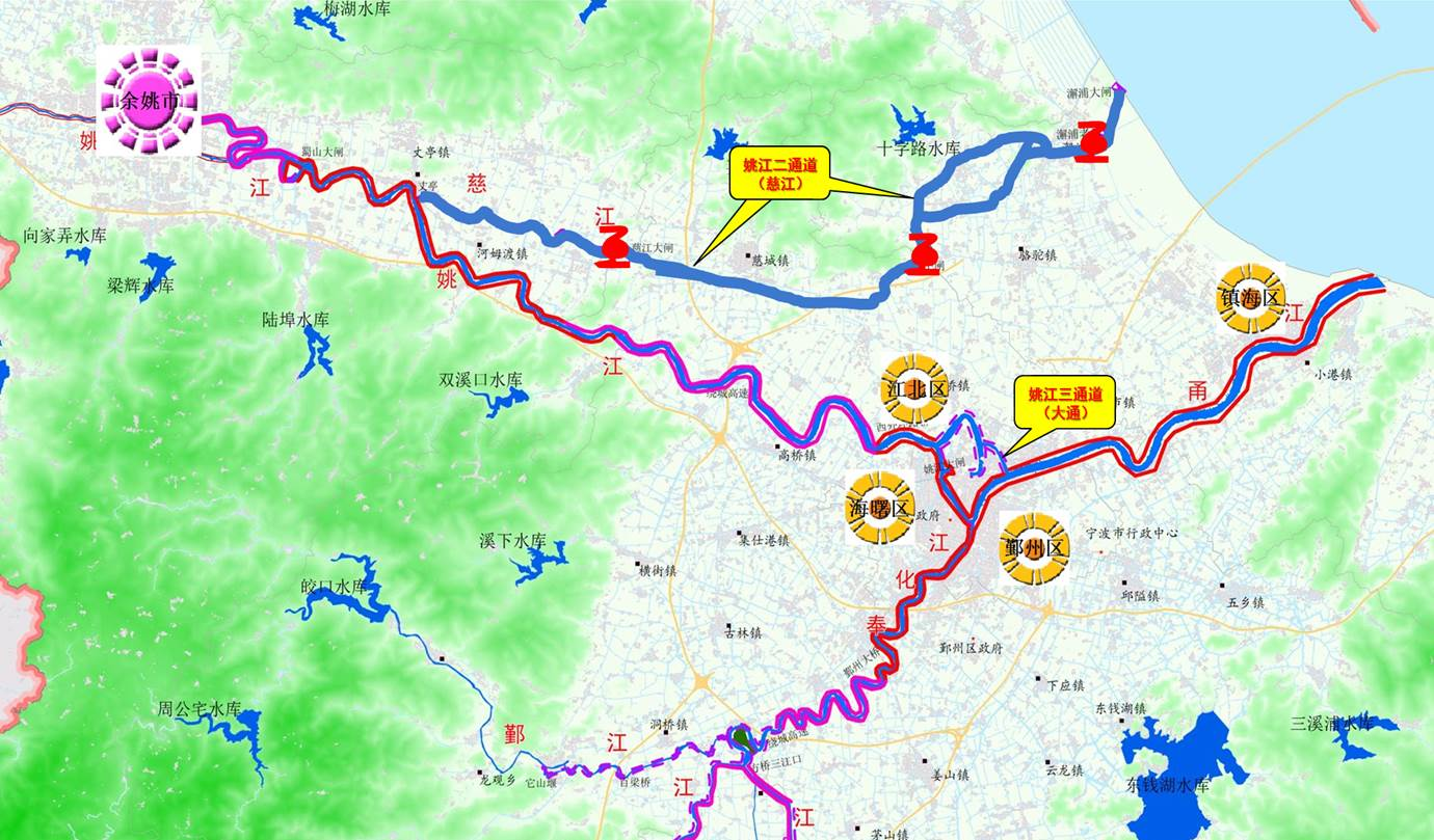 姚江東排工程(即姚江二通道(慈江)工程)西起慈江大閘,經(jīng)江北、鎮(zhèn)海沿山大河,自西向東由澥浦大閘外排入杭州灣,工程全長約34km,研究為有效克服土地、資金、工期等一系列要素制約問題,創(chuàng)新性引入“高速水路———梯級泵站排水”設(shè)計理念,切實解決了濱海平原地區(qū)自流排水易受外海潮位頂托和河道輸水流速低、排水慢等問題,該方案于2015年11月經(jīng)寧波市人民政府第70次常委會議審議通過,并納入省委省政府、市委市政府確定的姚江奉化江流域洪澇治理“6+1”工程。
