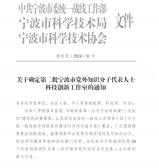 近日,寧波市統(tǒng)一戰(zhàn)線助力創(chuàng)新深化建功行動啟動儀式在寧波院士中心舉行。啟動儀式上,市委常委、統(tǒng)戰(zhàn)部部長林雅蓮為第二批寧波市黨外知識分子科技創(chuàng)新工作室團隊授牌。寧波市黨外知識分子科技創(chuàng)新工作室由市委統(tǒng)戰(zhàn)部會同市科技局、寧波市科協(xié)認定。我院張預定創(chuàng)新工作室位列其中。