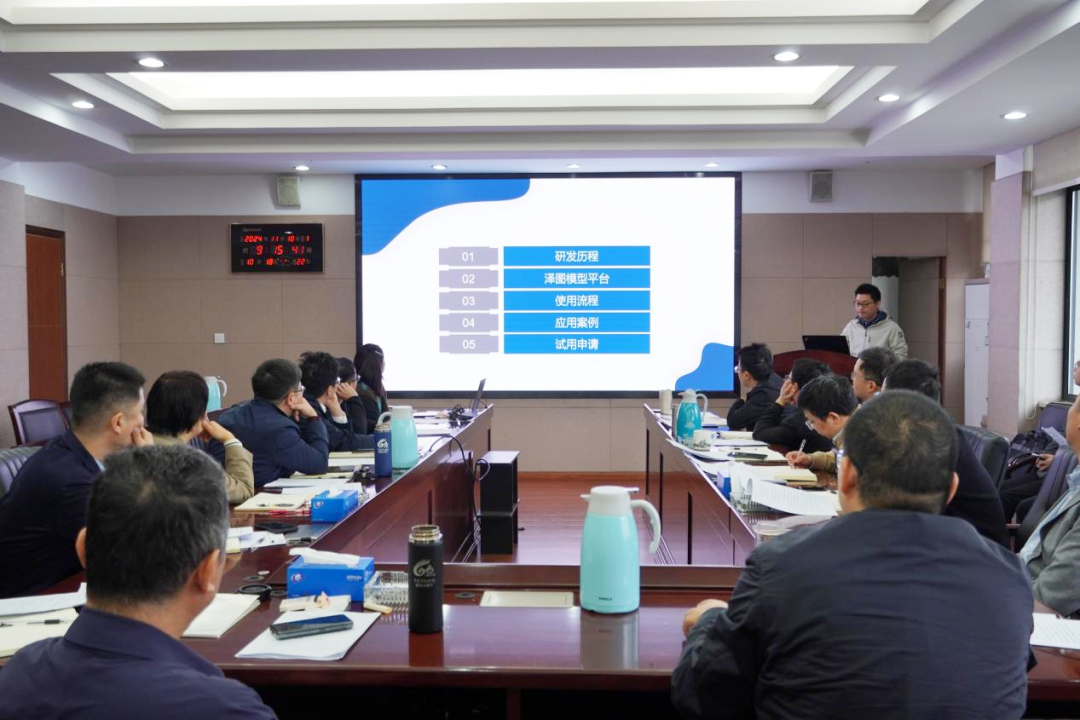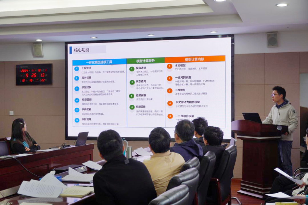 隨后,平臺(tái)研發(fā)團(tuán)隊(duì)代表陳龍贊對(duì)“澤圖水文水動(dòng)力一體化模型平臺(tái)”進(jìn)行詳細(xì)介紹,并進(jìn)行現(xiàn)場(chǎng)實(shí)操演示。該平臺(tái)是一套我院自主研發(fā)的以組件化建模、并行化求解、在線化計(jì)算、一體化耦合、國(guó)產(chǎn)化支持為核心的水文水動(dòng)力模型平臺(tái),能夠滿足包括產(chǎn)匯流計(jì)算、水庫(kù)調(diào)度、一維河網(wǎng)、二維淹沒(méi)、水文水動(dòng)力耦合、一二維水動(dòng)力耦合在內(nèi)的多種模擬需求,適用于獨(dú)立部署、嵌入第三方項(xiàng)目等多種應(yīng)用場(chǎng)景。基于建模工具、模型服務(wù)、計(jì)算核心三分離的設(shè)計(jì)架構(gòu),平臺(tái)具備分布式部署、集群化管理、多節(jié)點(diǎn)負(fù)載均衡的動(dòng)態(tài)能力,滿足靈活適用多種尺度的計(jì)算需要。